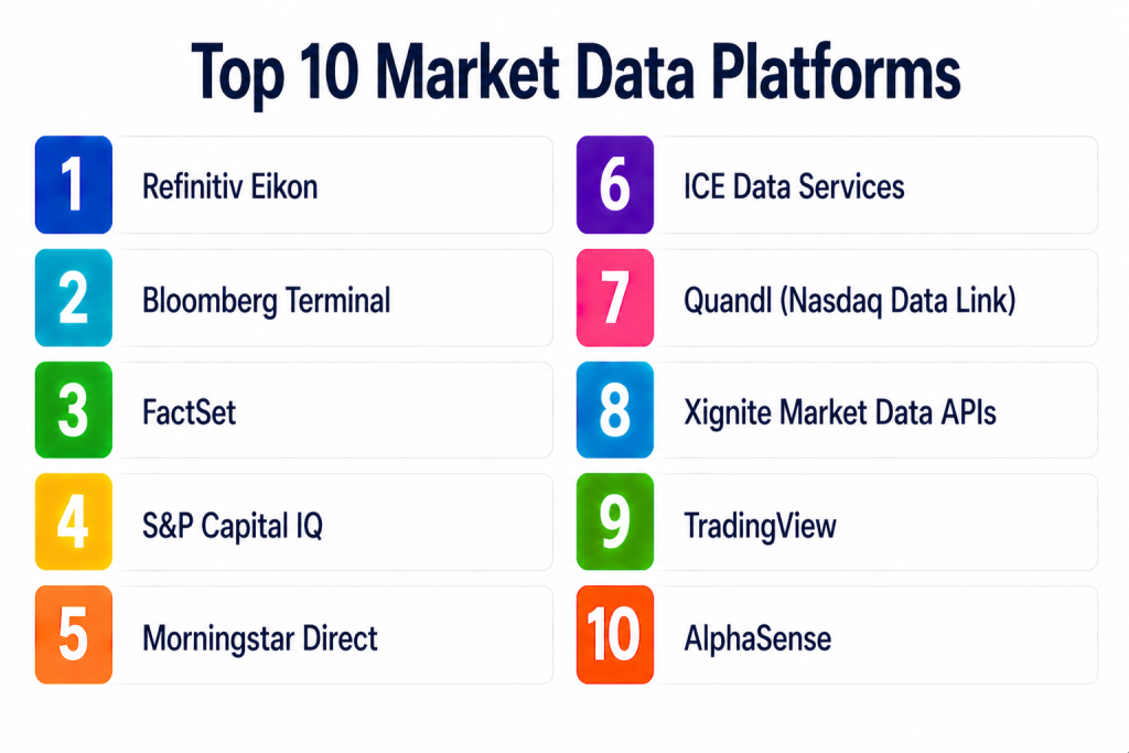 Market Data Platforms are essential for financial professionals seeking timely insights and analytics. Enterprise solutions like Bloomberg, Refinitiv Eikon, and AlphaSense provide comprehensive global coverage and advanced analytics. Mid-market platforms such as FactSet, S&P Capital IQ, and Morningstar Direct offer flexible research and portfolio analysis capabilities. Developer-focused platforms like Quandl and Xignite provide API-first access for quantitative research. The right platform depends on user role, data needs, and budget. Organizations should evaluate real-time access, multi-asset coverage, and integration capabilities. Pilot implementations help assess usability and ROI. Ultimately, the best solution aligns with trading, research, or investment strategy objectives.