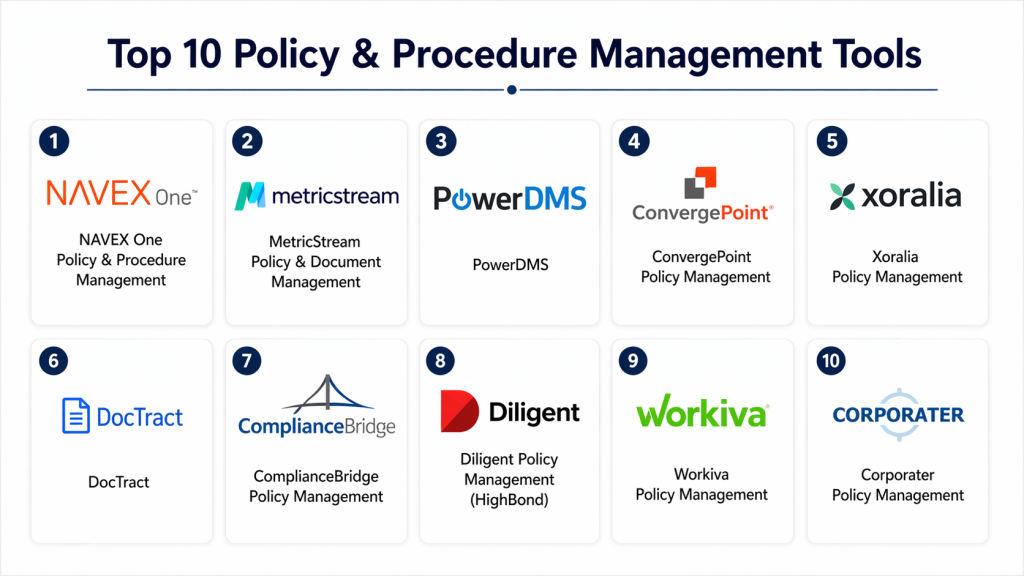 Policy & Procedure Management Tools help organizations create, manage, distribute, and track internal policies and standard operating procedures in a centralized and controlled environment. These tools ensure that employees have access to the latest versions of policies, acknowledge them when required, and follow consistent processes across departments.
