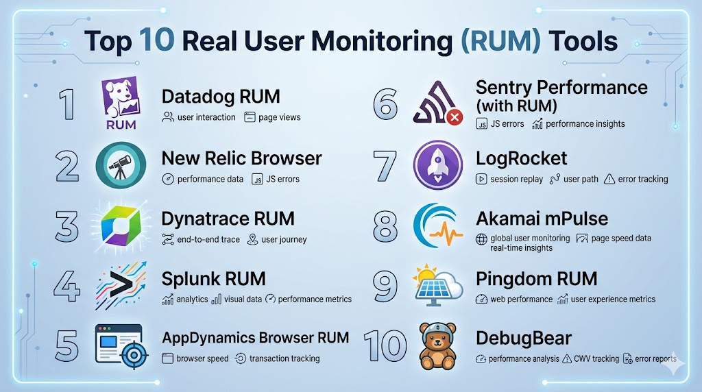 Real User Monitoring (RUM) Tools are essential for understanding how real users experience your applications and websites. By capturing live performance data, these tools help teams identify issues, optimize performance, and improve user satisfaction. Whether you choose enterprise-grade platforms like Dynatrace and Datadog or lightweight solutions like Pingdom and DebugBear, the right tool depends on your scale, budget, and user experience goals. As digital experiences become more critical, investing in RUM tools is key to delivering fast, reliable, and engaging applications. Start by testing a few tools, analyzing their insights, and integrating them into your observability strategy for maximum impact.