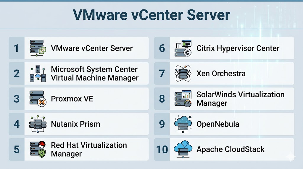 Strong options: VMware vCenter Server, Nutanix Prism, Red Hat Manager.