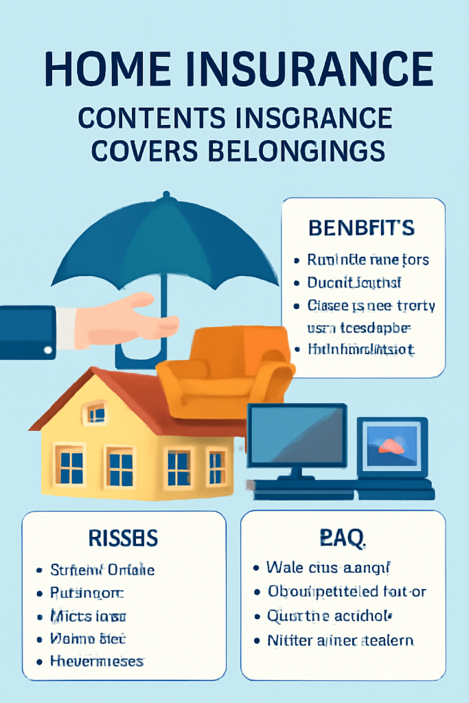 Home Insurance Contents Insurance (often called Contents Insurance) covers the personal belongings inside your home against risks such as theft, fire, natural disasters, or accidental damage. This insurance protects items like furniture, electronics, clothing, appliances, and other valuables inside the home.