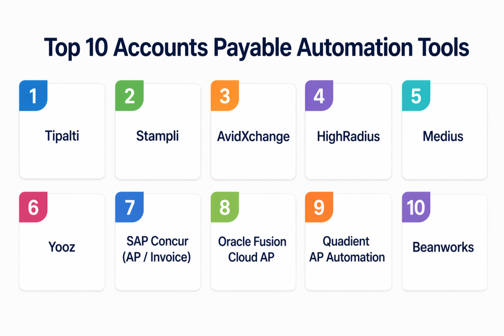 Tipalti, HighRadius, SAP Concur, Oracle AP are best for complex operations.
