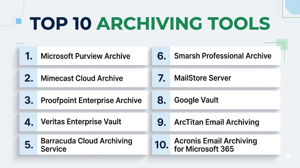 Archiving Tools help organizations securely store, retain, search, and manage historical business data for long periods. Unlike standard backups, archiving platforms are optimized for retention, legal discovery, compliance, storage efficiency, and quick retrieval of older information such as emails, documents, chats, logs, and records.