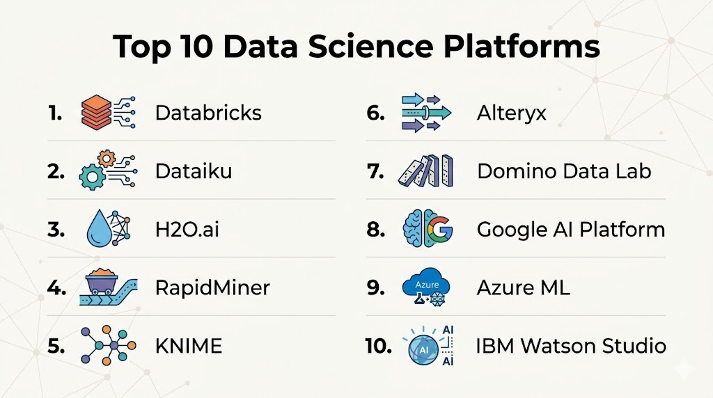 Data science platforms streamline analytics, machine learning, and AI workflows, enabling organizations to extract actionable insights from data efficiently. Small teams can leverage H2O.ai or KNIME for cost-effective and flexible modeling. SMBs may adopt RapidMiner, Alteryx, or Dataiku for collaborative workflows. Mid-market organizations benefit from Databricks or Domino Data Lab, offering scalable analytics, reproducibility, and MLOps capabilities. Enterprises with global-scale requirements can leverage Google AI Platform, Azure ML, or IBM Watson Studio for fully managed, secure, and compliant ML workflows. Choosing the right platform involves evaluating features, ease of use, scalability, integrations, security, and cost. Pilot testing with key data workflows ensures that selected platforms meet both technical and business requirements, enabling organizations to maximize the value of their data and models.