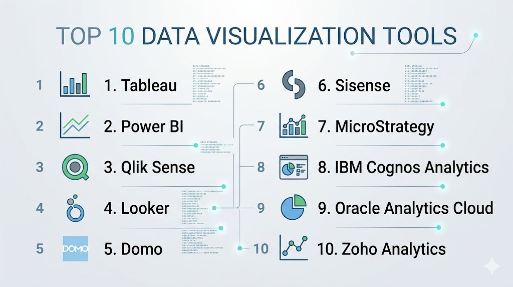 Data visualization tools are critical for transforming raw data into actionable insights through charts, dashboards, and interactive reports. Choosing the right tool depends on team size, data complexity, budget, and integration requirements. Small teams can leverage Zoho Analytics or Power BI, while mid-market organizations benefit from Domo, Qlik Sense, or Looker for interactive dashboards and predictive insights. Enterprises requiring large-scale visualization, embedded analytics, and AI-powered insights may opt for Tableau, MicroStrategy, or IBM Cognos Analytics. Important factors to consider include ease of use, integrations, scalability, security, and cost. Teams should shortlist 2โ3 tools, run pilots with critical data sources, validate dashboards, and adopt a platform that balances functionality and usability. With the right visualization tool, organizations can improve decision-making, enhance collaboration, and turn complex data into clear insights for all stakeholders.