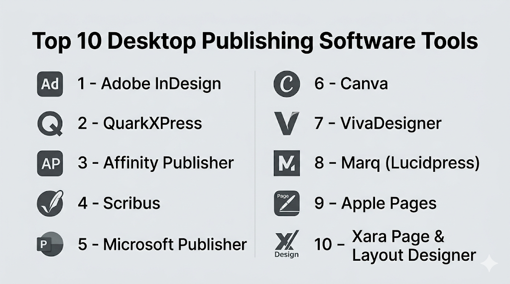 Desktop publishing software (DTP) is used to design, layout, and produce visually rich documents such as magazines, brochures, books, catalogs, and marketing materials. Unlike standard word processors, these tools provide precise control over typography, page layout, images, and print-ready output.