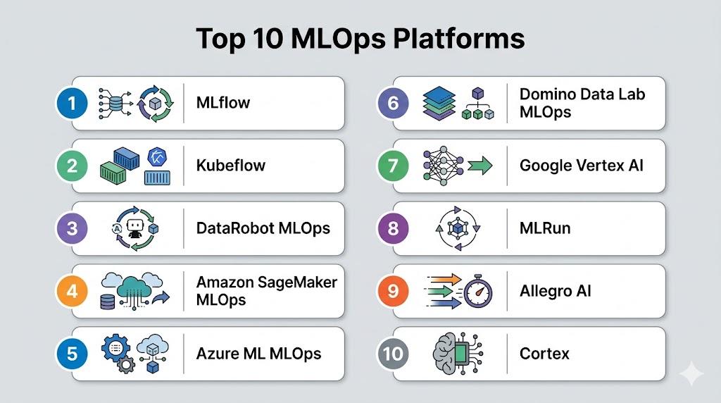 MLOps platforms streamline the production, deployment, monitoring, and governance of machine learning models, ensuring reproducibility, scalability, and reliability. Freelancers and small teams can leverage MLflow or MLRun for lightweight, open-source operations. SMBs benefit from cloud-managed solutions such as Vertex AI, SageMaker MLOps, or Azure ML MLOps for low-code automation. Mid-market organizations can adopt DataRobot or Domino Data Lab MLOps for collaboration and reproducibility at scale. Enterprises requiring production-grade, Kubernetes-native MLOps may rely on Kubeflow, Allegro AI, or Cortex for end-to-end model lifecycle management. Selecting the right platform involves evaluating scalability, integrations, ease of use, and governance. Pilot testing with critical models ensures the platform meets both technical and business requirements, enabling efficient and reliable AI operations.
