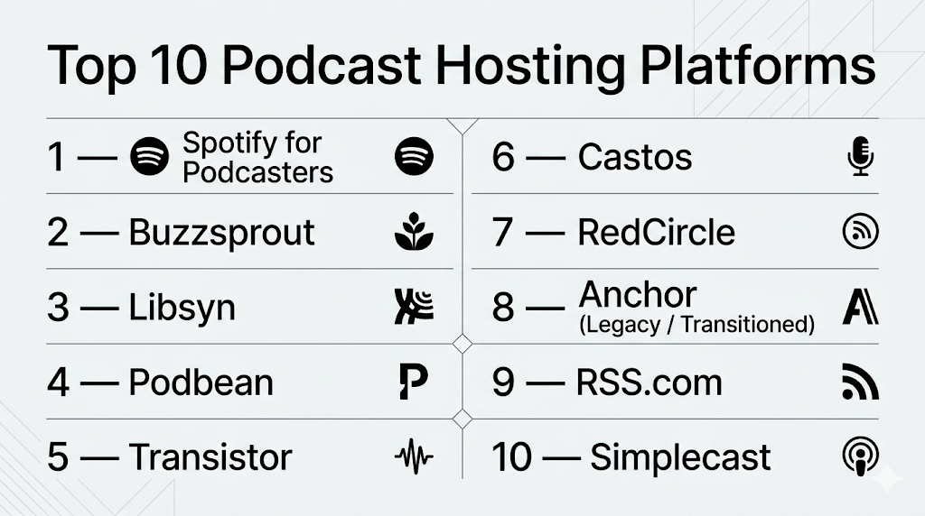 - Best options: Spotify for Podcasters, Buzzsprout