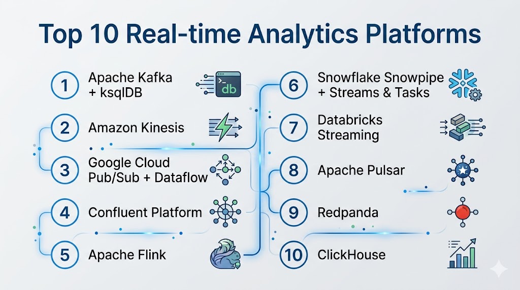 Real‑time analytics platforms are essential for organizations that need instant insights from streaming data to power operations, customer experiences, and competitive advantage. Choosing the right platform depends on your scale, team expertise, and integration footprint. Smaller teams can leverage simpler platforms like Redpanda or ClickHouse, while managed services such as Amazon Kinesis or Snowflake Streams & Tasks reduce operational overhead. Mid‑market organizations may find balanced power and ease with Google Cloud Pub/Sub + Dataflow or Databricks Streaming, whereas large enterprises benefit from full‑featured ecosystems like Confluent Platform, Apache Kafka + ksqlDB, or Apache Flink for high throughput and complex analytics. Evaluate latency, scalability, security, and total cost when selecting a solution, and consider running pilots with critical data sources to validate architectures. With real‑time insights, organizations achieve faster decisions, improved operational awareness, and stronger customer engagement, positioning them for success in dynamic markets.