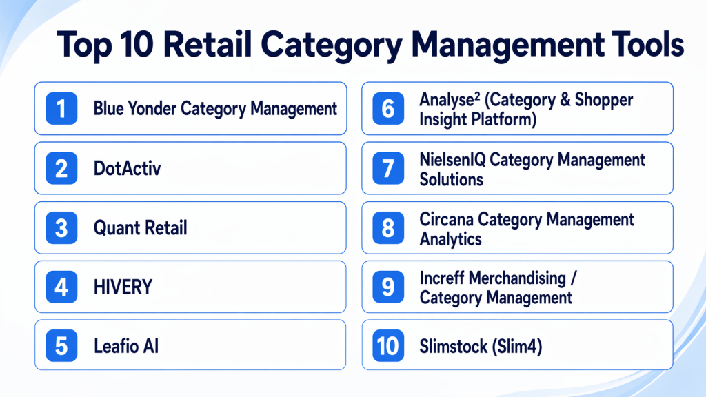 Retail Category Management Tools help retailers organize products into meaningful categories and optimize how those categories perform across stores and digital channels. In simple terms, these tools answer critical questions like what products should be stocked, how much shelf space they should get, how they should be priced, and how they perform compared to competitors. They combine data, analytics, and planning workflows to improve category-level decision-making.