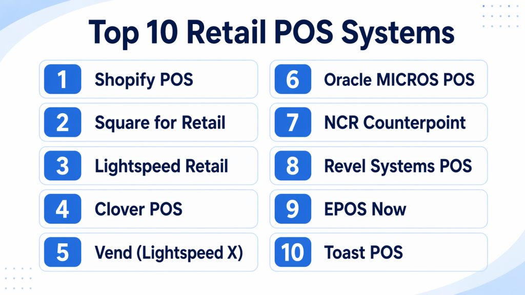 Clover POS, Revel Systems, and NCR Counterpoint for scalable operations.
