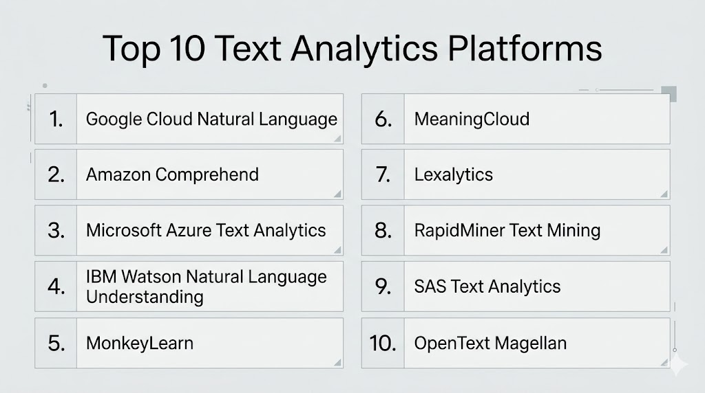 Text analytics platforms are essential for extracting value from unstructured data, enabling organizations to gain insights, automate workflows, and improve decision-making. Open-source and lightweight tools like MeaningCloud and MonkeyLearn provide simplicity for smaller teams, while platforms like Amazon Comprehend and Azure Text Analytics offer scalable cloud-based solutions for growing organizations. Mid-market users benefit from tools like RapidMiner and Lexalytics, which combine analytics with NLP capabilities. Enterprises requiring advanced features and high performance can rely on Google Cloud Natural Language, SAS Text Analytics, and IBM Watson for comprehensive solutions. Selecting the right platform depends on factors such as accuracy, scalability, integration, and cost. A practical approach is to pilot a few tools, evaluate real-world performance, and choose the one that aligns best with your business needs and technical requirements.